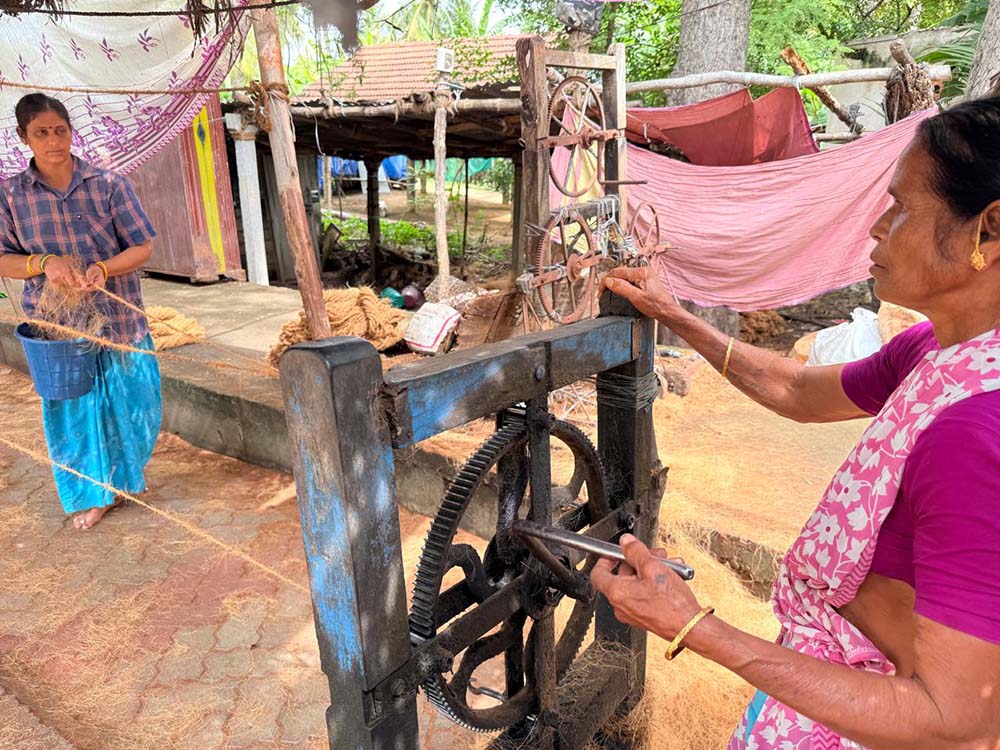 The Coir-making Project turns the coconut fibre taken from each nut and turns it into sturdy rope. But to do this requires community effort and the provision of simple hand turning machines. We help by making sure the women have these provided and offer the coir from the plantation. Annakili, a 41-year-old mother from a marginalized background and mother of seven children had no stable income and little support, so daily survival was a challenge. The Coir Making Project equipped her with the skills, tools, and a platform to earn a steady income to care for her children and ensure that they don’t face the same struggles she endured.